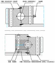 雙排球式回轉(zhuǎn)支承具有三個(gè)座圈,鋼球和隔離塊可直接排入上下滾道,根據(jù)受力狀況,安排了上下兩排直徑不同的鋼球。